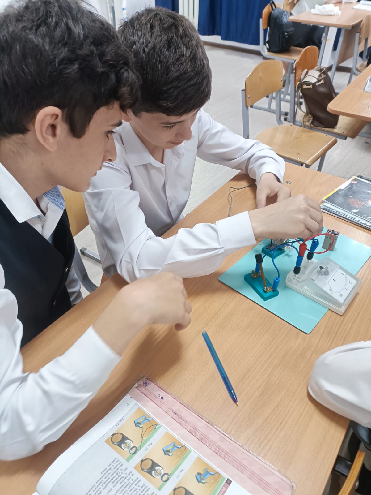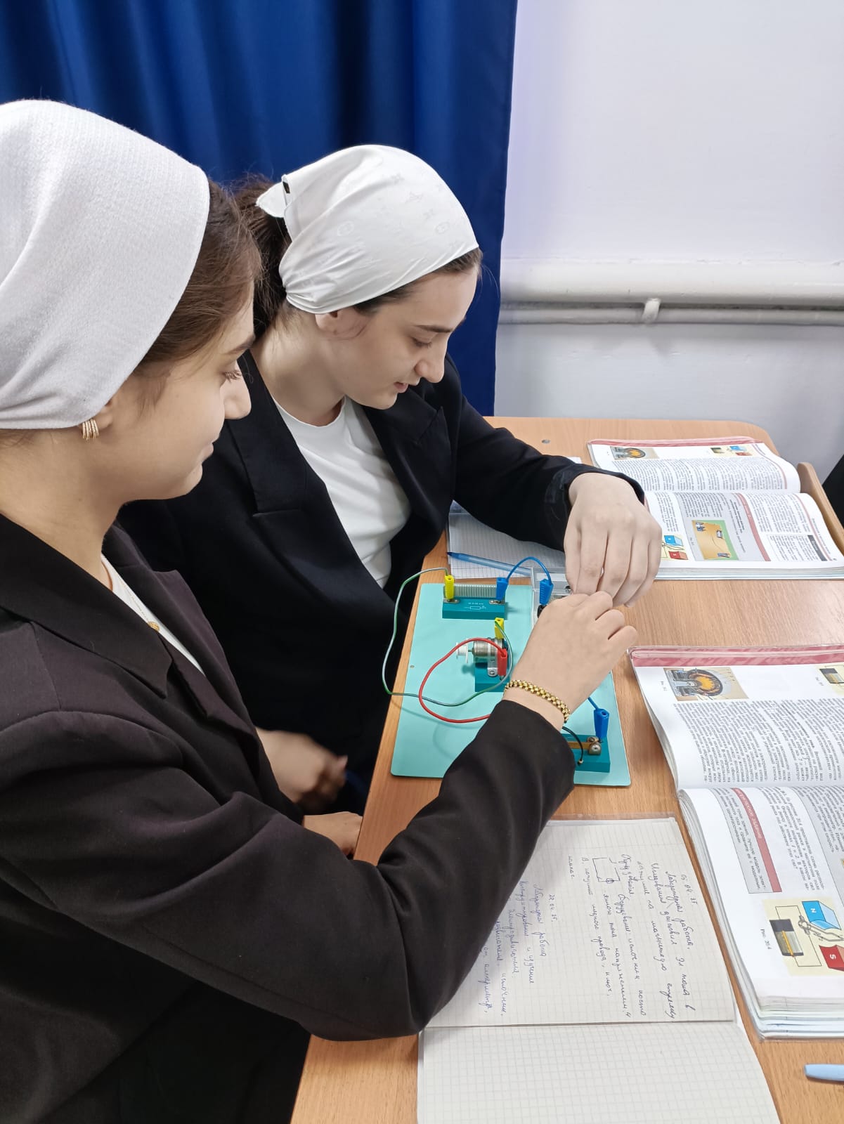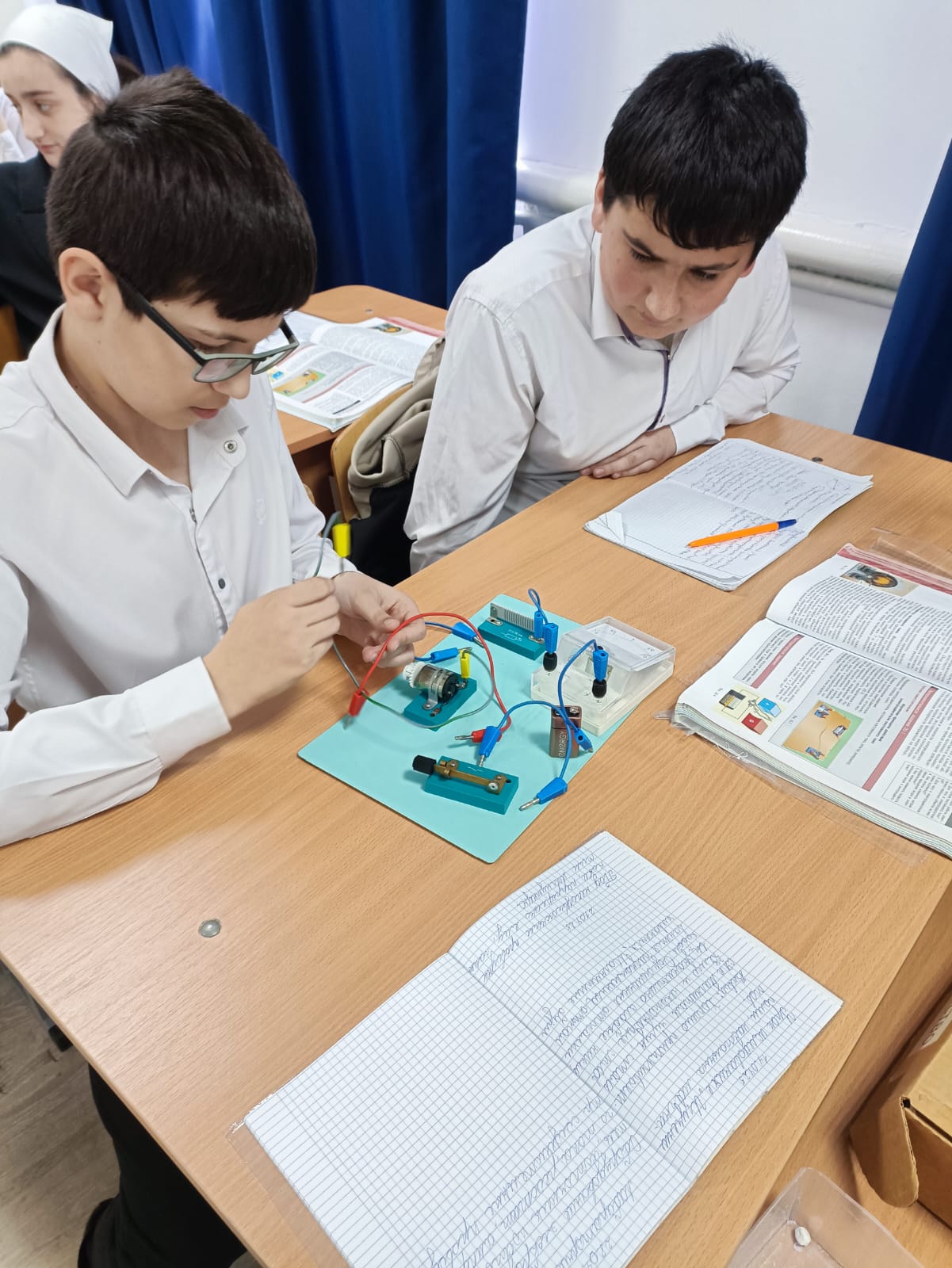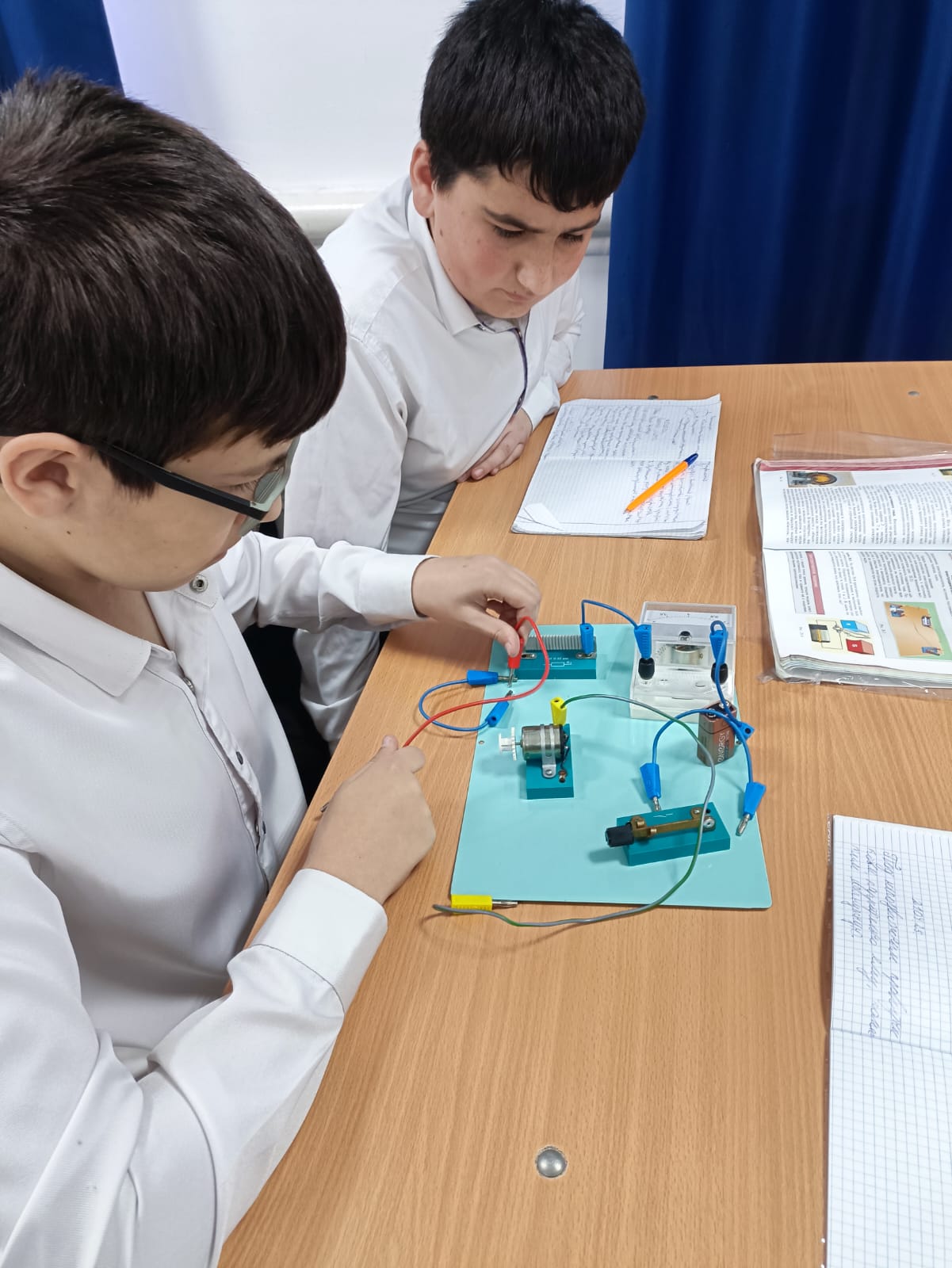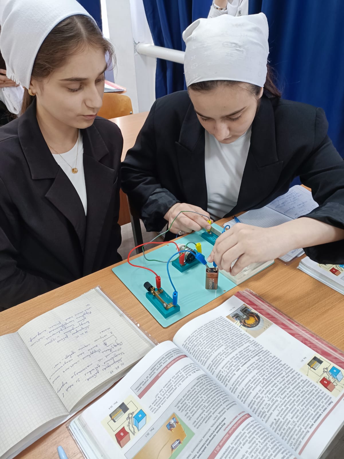 22.04.2025В 8 Б классе проведена лабораторная работа по теме "Изучение принципа действия электродвигателя постоянного тока". Учащиеся Салгириева Айшат и Баудинова Аминат собрали работу и сделали вычисления.Баталов Сайд-Ахмед и Шаипов Мовсар наблюдали работу электродвигателя. Шаипов Мовсар показывает, как собрать цепь Басханову Джамбулату.