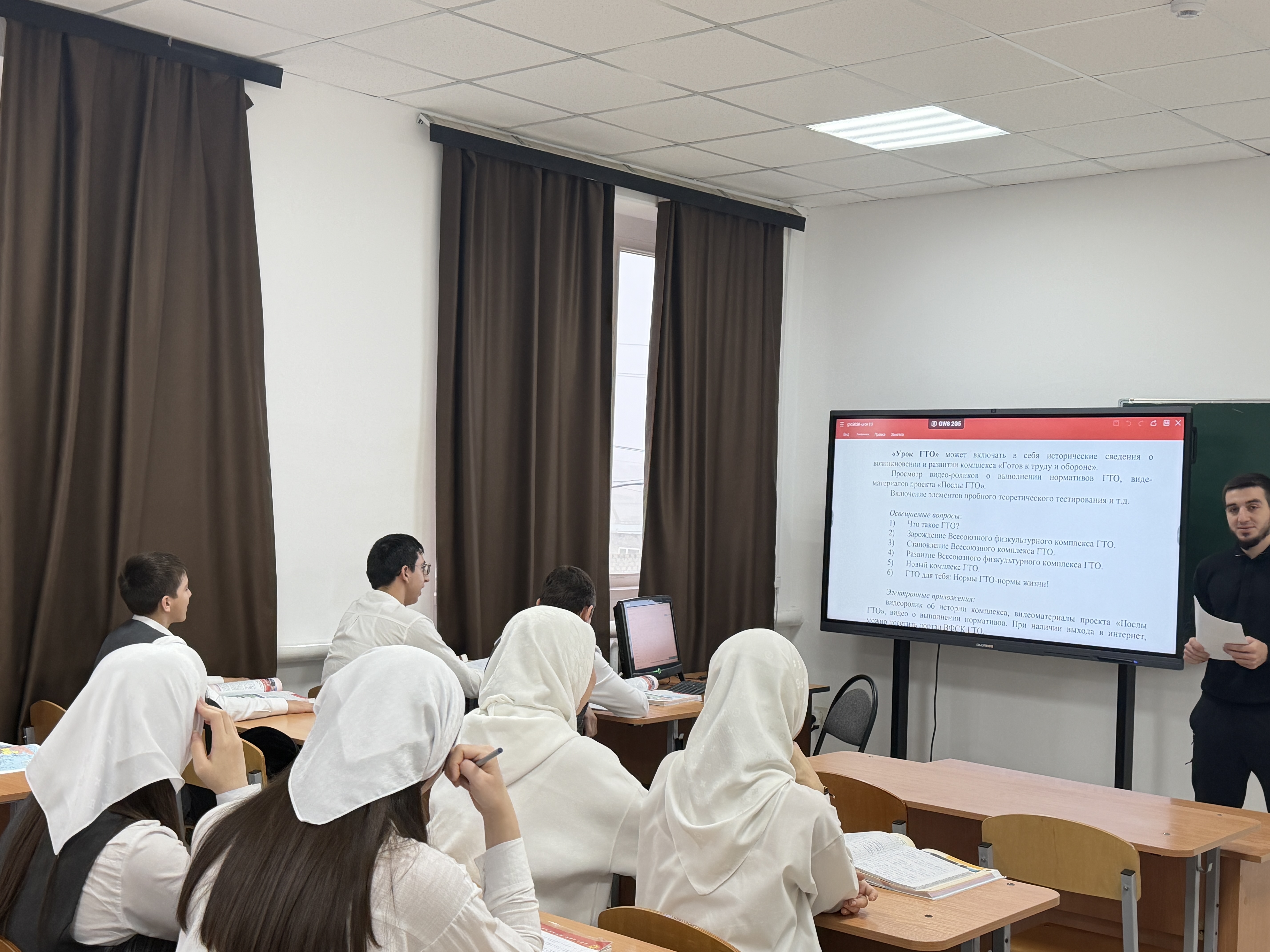 Учитель физической культуры Хизраев М.М. познакомил учеников с историей ГТО. В ходе мероприятия ребята познакомились с презентацией по истории, становлению и развитию комплекса ГТО в нашей стране, нормативами выполнения физкультурно-спортивного комплекса «Готов к труду и обороне». Они узнали, что комплекс «ГТО» предназначен для повышения уровня физической подготовленности, самосовершенствования и поддержания здорового образа жизни. В заключение были сделаны выводы, для чего нужно стремиться молодежи 21 века к выполнению нормативов ГТО, к получению знаков отличия? Ответы получились разные: кто-то хочет достичь конкретного результата и проверить свою силу воли и настойчивость, кто-то привык быть всегда первым в учебе и спорте, кто-то заботится о своем здоровье. Но все ребята сошлись во мнении, что комплекс ГТО необходим нам, современным людям. Ведь только целеустремленные и физически подготовленные люди смогут добиться успеха!